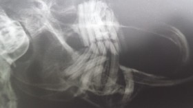 Extraktion eines retinierten Milchzahnes bei einem 10 Monate alten Pinscher